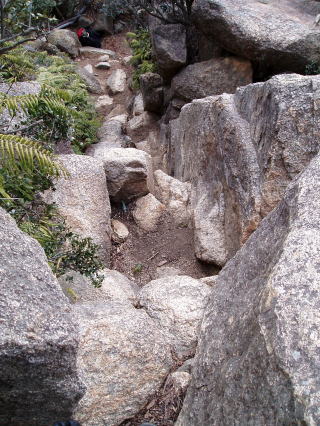 | 白い表札のかかる岩梯子 | 岩梯子の上から見下ろしたところ | |