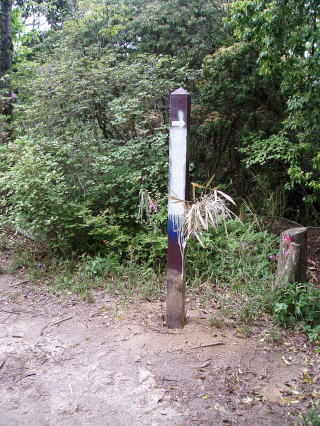 深江山の神の入口にある道標 ペンキでし白く塗りつぶされている。 惜別の意?を表すために、2本の笹が 立てられている。 (2005年5月10日撮影) |
