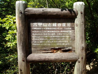 六甲山が禿山であったことに言及した 看板。 中央尾根の風吹岩に至るハイキング コースの中ほどに立っている。 |
