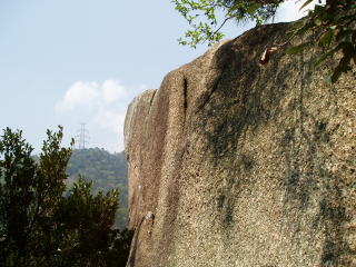 | 樹林の上に岩の先端が覗く。 | 金網に覆われた岩 | |||