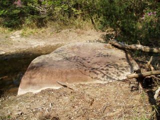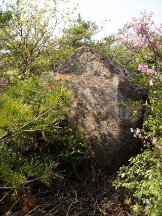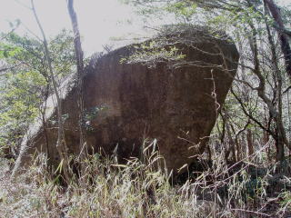| 老ヶ石(大石) 触れると老けるといわれる巨大な老ヶ石 この岩には「血を流した老ヶ石」というおもしろい民話(目次7)がある。 これについて、柴田昭彦氏の綿密な研究報告がある。 「ものがたり通信 」老ヶ石の伝説 場所:船坂谷中流 林道の終点 |