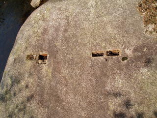| 上の岩に彫られた四角い石の穴。 この穴は矢穴(やあな)と呼ばれ、 石を割るためにくさびを打ち込んだあとである。 (文献B参照) |