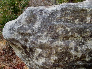 | 蛙の正面の顔である | 蛙の顔の拡大写真 横に走る溝が口、その上の二つの窪みが眼。 |