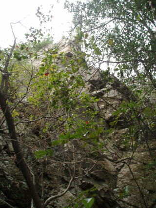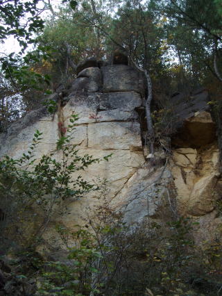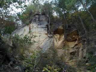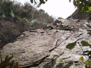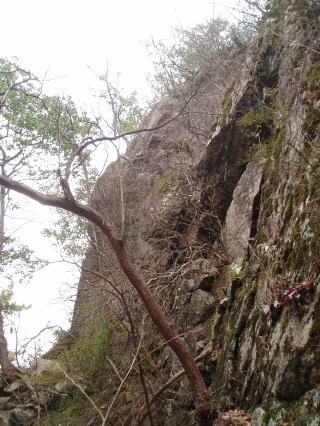 | 最上部の岩壁、中央部には水路とおぼしき黒い溝が見える。 | 送電鉄塔の近くの最下部の岩壁 岩登りの対象としては、緩い傾斜である。 |