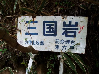 | <三国岩の地名の変遷> 三石岩は三国岩の古名であり「さんごくいわ」と読む、この近くにある三等三角点の点名も三石岩となっている。また、明治44年10月30日発行の大日本帝国陸地測量部の地図 p126にもその名がある。さらに、昭和8年の竹中靖一著「六甲」の添付地図には「サンゴク岩」と記載されている。 つまり、三石(さんごく)→サンゴク→三国(さんごく)→三国(みくに)と呼び名が変化したものと推定される。地名の変化を調べるのもなかなか面白い。思えば三石岩は、形態からくる素直な名前である。 また、この岩は山論に関して半国岩とも呼ばれ、谷上村と神戸灘村との国境となっていた。(『神戸歴史物語』小部史研究同好会p112 1989) 『神戸の史跡』 神戸市教育委員会編 1981 P44より引用 三国岩 六甲山の前ケ辻の旧武庫・菟原・有馬三郡の境界点に自然の巨岩が三つ集まっているので、三つ石、三郡岩とも三国岩ともいわれている。 六甲山系のなかに口一里、中一里、奥一里の名があり、慶長九年(1604)(注)に、山の南つまり神戸側十数か村と、北の山田村(今の北区)とか山論を起こしたが、そのときの文書にこの名がみえる。 この三国岩を基点として、それから南西へ塚を築き、それを見通して口、中、奥一里など境界線を定めていた。 この山論は室町時代から続き、慶長年間に再燃して、明治九年になって解決したという、珍しい山の境界争いであった。 (注)原文は慶長八年とあるが、中一里山山論のはじまりは慶長九年である。 |