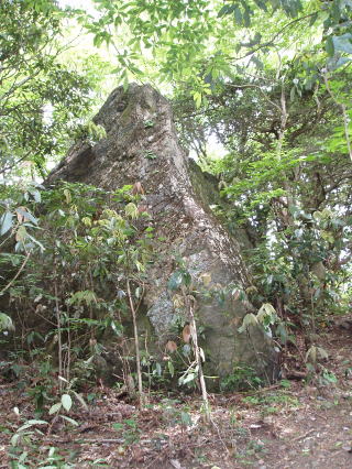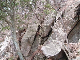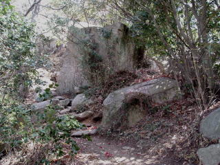 | 重箱岩 古地図(参照文献1)を見ていると、六甲山オリエンタルホテル南方の天狗岩の東に重箱岩と呼ばれる岩がある。古地図には、有名な天狗岩(標高769m)の記載はなく、代わりに太郎谷山(標高764m)の記載がある。 さらに、石切り道に立てられた説明板の中に、重箱山、重箱岩(石切り場の名前)の記載が見られる(写真参照)。重箱山の位置は不明であったが、図書館でふと手にした本(参照文献2)の中に石切場の記述を見つけた。 これから推定すると、重箱山とは、特定の山ではなく、山帳場が置かれた地域及び山帳場が管理する地域を指すものと考えられる。 私は最初、正月のおせち等をつめる重箱を想定し、そのような形態の岩を探索し、見つけることができずに悩んでいた。 しかし、重箱山の謂れはさておき、重箱岩とは単に重箱山地域にある岩と考えるのが最も自然であることがわかった。 後に知った<参照文献3 直木氏執筆の新聞記事>によれば、重箱岩は柱状の巨岩とのことであった。 右の写真では、岩場の西端がそれに相当する。 |