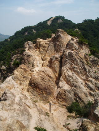 | 天狗岩の手前の標柱 | 天狗岩に至るルートは右手にある。 赤テープ有 |