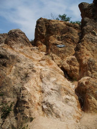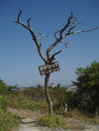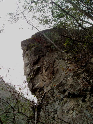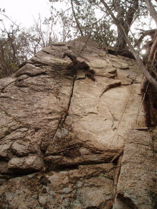| この看板の裏には「山で遊び山で学ぶ」とある。いい言葉だ。 | 岩の頂部を下から見上げたところ。 | |||