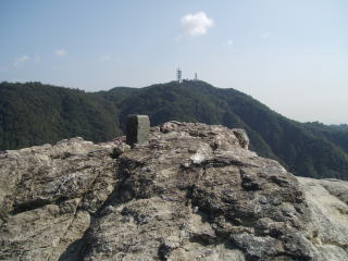| 天狗塚上部に設置された4等三角点687.8m | 摩耶山を望む。左のアンテナがあるところが摩耶山の山頂。 | |||