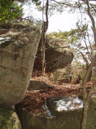 | 天狗岩の西側面 | 天狗の御座所。枯れた松葉でふかふかだ。 | |||