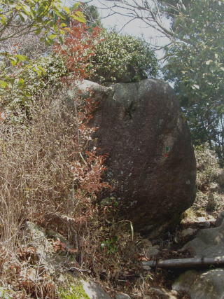 | 五助山 天狗岩 六甲山には、実に天狗と名のつく岩が多い。 この岩は、凌雲台から五助山に下るルートの最初に出会う巨岩である。 その下にも、大きな岩があり、この岩がはたして本当に古地図に示される天狗岩かどうかの疑問は残るが、今となっては確かめるすべもないので、位置的に、また天狗様の気持ち酌んで、この岩を天狗岩と判断した。 場所:凌雲台から五助山に下るルート <参照文献> 「六甲ー摩耶ー再度山路図」 直木重一郎著 関西徒歩会 1934年刊(昭和9年) |