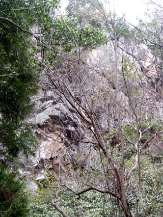 | 三笠岩(立岩) 1963年(昭和38年)に出版された大西雄一氏の「六甲ハイキング」は、読んでいて実に気持ちがいい。いかにも実際に山を歩いて書いているといった感じがひしひしと伝わってくる。説明図も丁寧で登山者の身になって描いてある。最近の、実際に山を歩かないで、机の上だけで書かれた儲け本位の案内書にうんざりしている私にとって、それは一服の清涼剤である。 さて、大西氏の「六甲ハイキング」の説明図によれば、トェンティクロスの高雄山ダムの前に三笠岩なる岩がある。 三笠岩、それはどのような岩なのか? 想像するに、三笠とは奈良の三笠山(若草山)を指し、その山容は笠状の山塊を三層に重ねた形をしているのだろうか。 それとも、御笠と解し、ひとつの笠形の巨岩であろうか。 調査に赴くと、その岩はすぐに見つかった。そして三笠の意味は、三層になった岩であることを知った。 岩登りの対象でもあったらしく、ひときわ高い中段の岩の背面には、古びたハーケンとボルトが残されていた。 この岩は昔、立岩と呼ばれていた。 神戸市立森林植物園内に立てられた説明板に中一里山境界図が紹介されているが、その中に一里塚として瀧谷道の「立岩」とある。トェンティクロスは瀧谷道の一部をなすことから、この岩がそれに該当するのかもしれない。 参照 「石楠花山の一里塚と生田川の立岩」 参照文献 「六甲ハイキング」 大西雄一著 1963年版 p153 説明図 『再度山史話』 添付地図 神戸中央図書館蔵 『六甲』 竹中靖一著 付録地図 複刻版1976年刊 参照サイト 「奈良県HP 若草山」 |