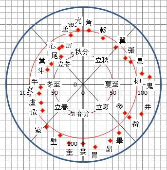 地上表現の二十八宿は左回り・方位は右回りとなる。