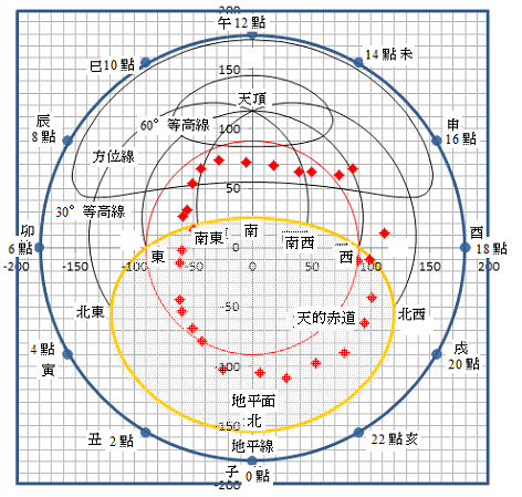 赤道:東西的圓弧 黃道:黃線的曲線 子午線:南中央的粗線