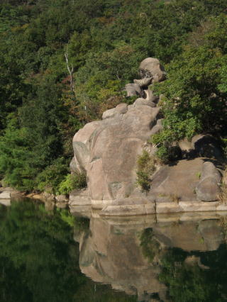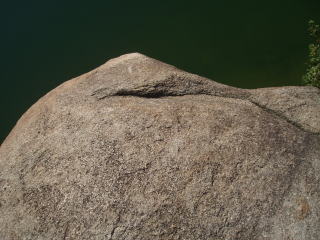 | サムロック ダイビングドームがある池の南東の角の通路沿い ジャミングでサムロックというのがあるが、そのようなクラックは見当たらない。 太めの指の形を洒落たのかも・・・ 「関西の岩場」 林照茂編 白山書房 1985年刊によると、この岩にも課題がある。 |
