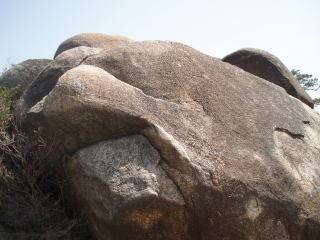 | タブチロック (ホースノーズ) エレファントノーズ(象の鼻)に対して、こちらはホースノーズ(馬の鼻)だ。 「関西の岩場」 林照茂編 白山書房 1985年刊によると、この岩にも課題がある。 場所:コックロックからヒクイノクスを右に見て、北に向かう細い道をたどると、右手にその頭が見える。 |