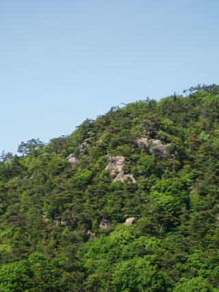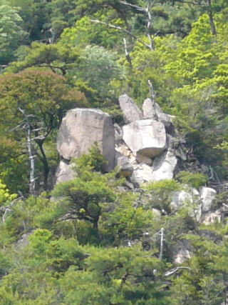 | バッタ岩 遠くから眺めると山腹に 巨大なバッタが 潜んで居るみたいだ。 場所:荒地山道畦谷山腹 南の尾根のルートから 藪こぎ(かなり大変で 危険) |