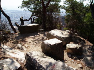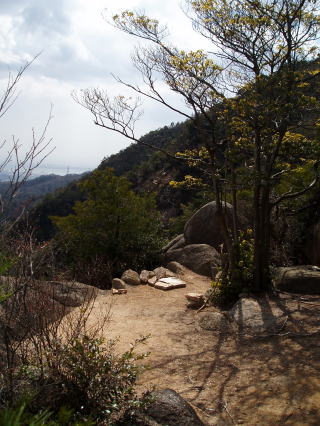 | 石のベンチ 眺望抜群 明るい雰囲気の休み場である。 場所:荒地山道畦谷北尾根 |