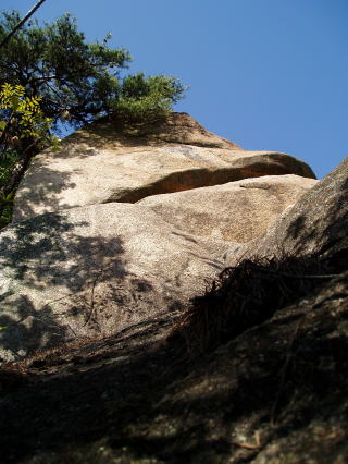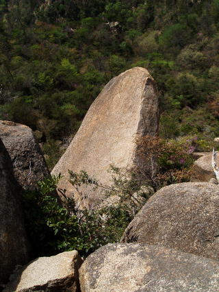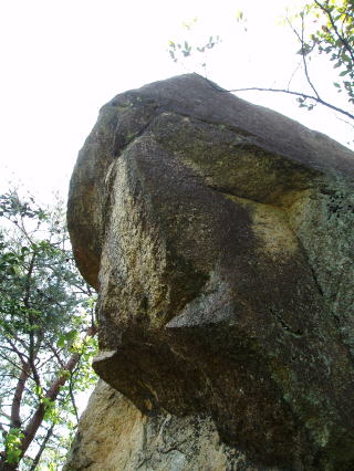 | ダルマ岩 場所:高座谷から風吹岩に向かうルートのおいて、キャッスルウォールを越えた所に谷川を左に分岐する登山道がある。この岩は、その登山道を少し歩むと、道に立ちふさがるように立っている。 |
