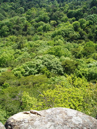 | 傾き岩 ここは、人があまり来ない静かな岩のテラスだ。 眼下に広がる緑は多彩に変化し、緑のシンフォニーを奏でる。 場所:荒地山中部中腹 水場のある小屋のルート |