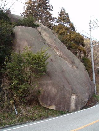 | 図2A 上部に注連縄のかけられた鏡岩の正面 前部は欠けているが、外形はいびつな 不等辺六角形に近い |