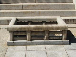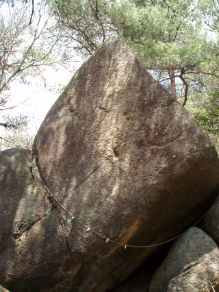 図8B 剣岩の正面拡大写真 三つ並んだ穴ぼこが認められる。 注連縄の掛かっている部分は岩が分離しているように 見えるが一体物である。 左下に向かって走っている線の連続性からも明らかである。 |