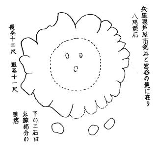 『六甲山の東麓の国有林中に、剣谷と称する一渓谷がありその西方は宮川谷といい、両谷の境をなす峰尾の上に、径十三尺厚さ三尺程の巨石があって、その表面を径八尺の円形に削り四囲を小山形に刻んだ一巨石がある。三種の神器の八咫鏡のことを知る者なりせば、一見直ちにその八咫鏡を象る鏡石たることを悟り得るのである。』