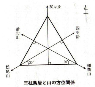 秦氏の根拠地である京都太秦に木島(このしま)神社がある。この神社には三柱(みはしら)鳥居と呼ばれる三方から拝むことのできる奇妙な鳥居(図26)がある。鳥居の中心には磐座が設けられている。三柱(みはしら)鳥居に関して、「秦氏の研究」大和岩雄著 大和書房 1993年刊 p312〜324に詳細な記述があり、図27Aの方位の説明図が掲載されている。