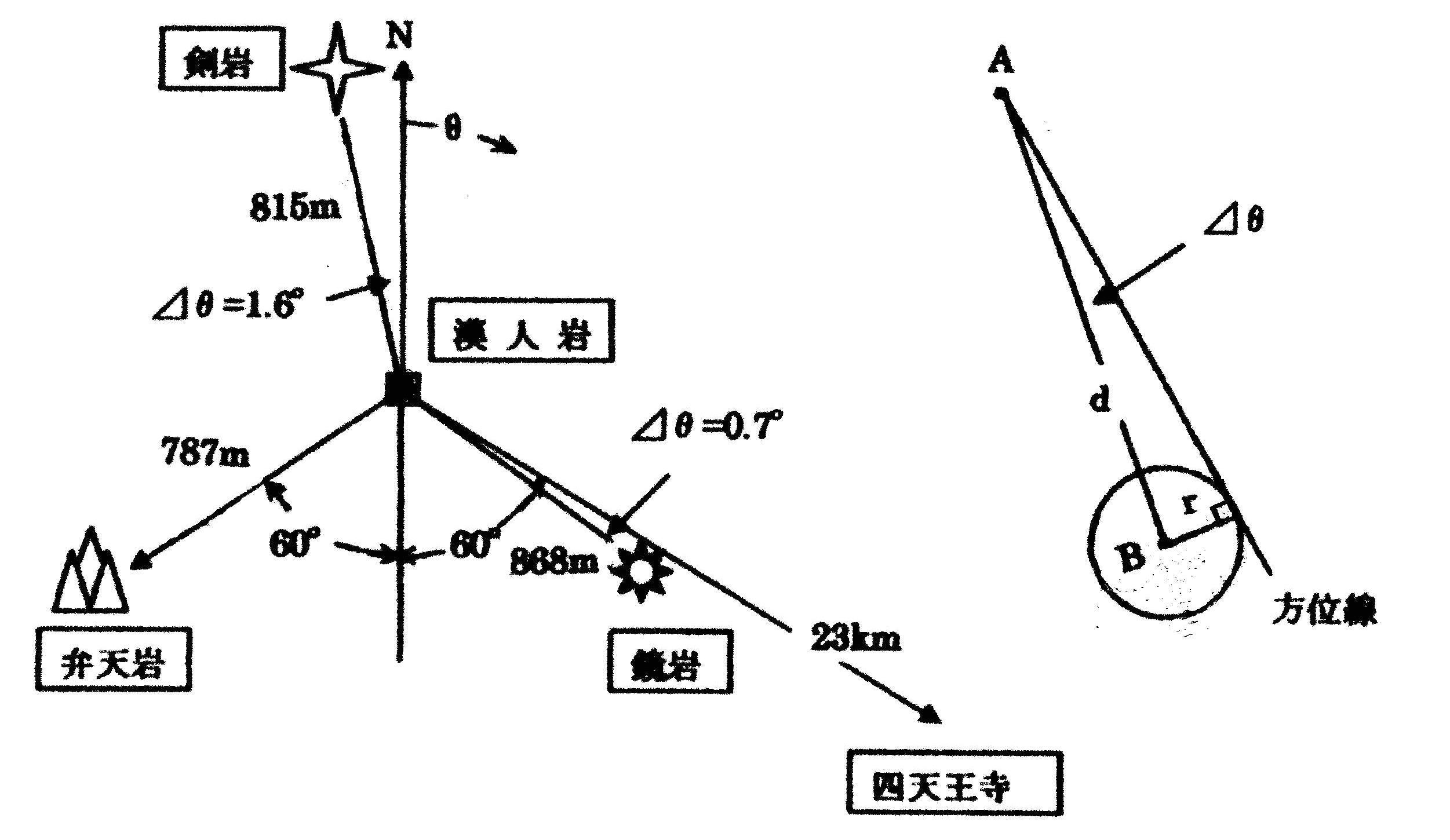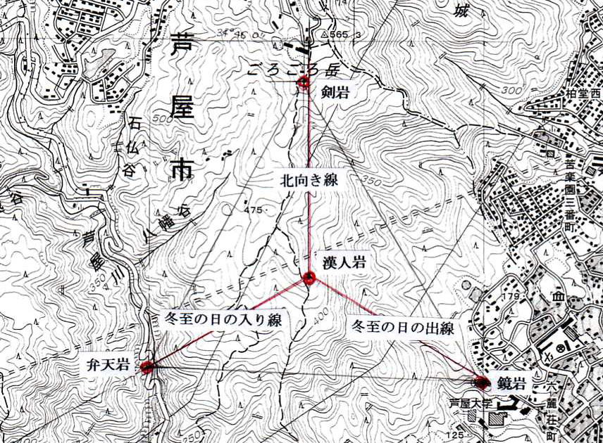森北町遺跡(注1a) 会下山遺跡(注1b) 前漢楽浪郡(注2) 四天王寺創建(593年) 奇岩(磐座?)------------○--------------○---------------------------------八咫の鏡岩(磐座) 鏡岩(前漢鏡) 八咫の鏡岩 この頃朝鮮半島からの渡来人多し 巨岩(磐座)-----------------------------------○----------------------------弁天岩(磐座) 天の岩屋戸 雨乞い信仰・白山信仰 平凡な岩------------------------------------------○-----------------------平凡な岩 漢人岩 江戸時代の石切り場 剣岩(磐座)--------------------------------------------○-------------------叢雲の剣岩(磐座) 北斗の剣岩 聖なる三角配置の完成(7世紀初頭) |