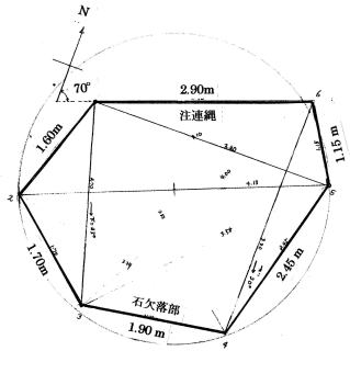図4 鏡岩を不等辺六角形に見立てた時の寸法見取り図 (2006年8月実測) 面積9.2m2 厚さ(推定)0.9m 体積8.3m3 重量22ton(花崗岩の比重2.65) |