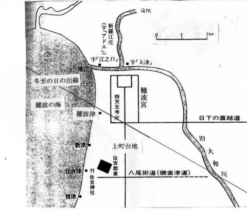 難波津は当時の大陸を結ぶ国際貿易港であった。外来文化の精華ともいえる四天王寺は、渡来人にとって故郷を偲ぶ新たな聖地となった。そしてこのことが、後に述べるように聖なる三角配置の構想を導き出す契機となった。