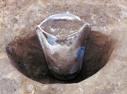 重機の掘削により身の大半が失われていたが、鈕の破片が倒立した状態で埋まっていた。