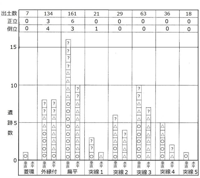 グラフに示したものは銅鐸を横置きしたものであるが、上段には、銅鐸を正立・倒立に埋納した遺跡の数を記載した。