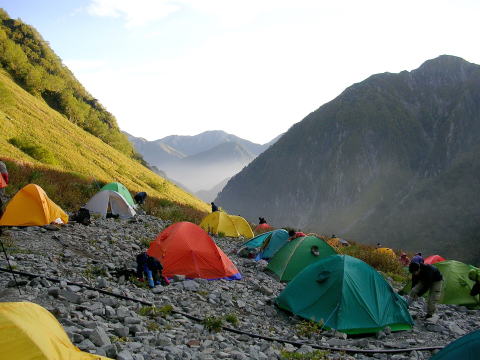 | 朝日を浴びる奥穂高岳 | キャンプ場の朝 | |
