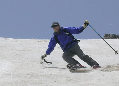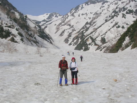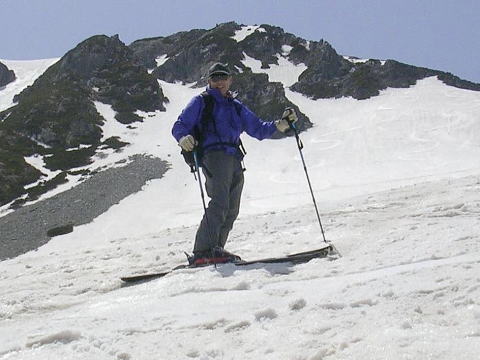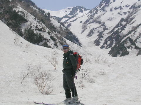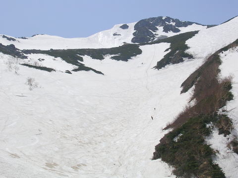 マヤクボ沢全景。デブリもなく快適な滑りが楽しめた。後ろは、さっき登った針ノ木岳。