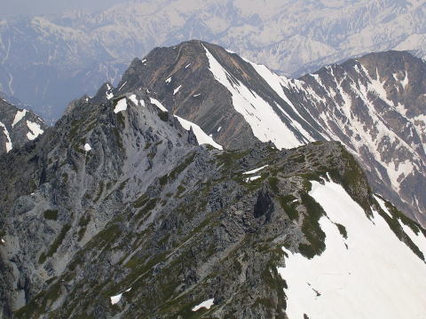 下から見ると存在感の大きな雪庇であるが上から見ると小さく見える。針ノ木の頭から稜線を少し登ると、鹿島槍がはっきりと見えるビューポイントに着く。