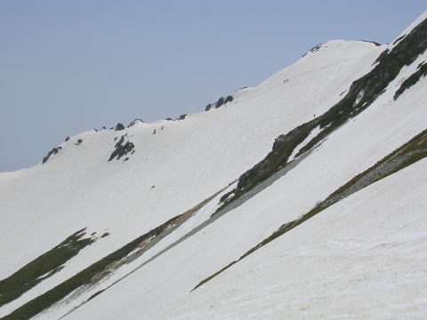 さらに傾斜がきつくなる。針ノ木の頭はすぐそこに見える。