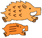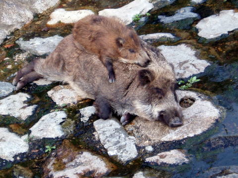 親猪の背中に子猪が乗っかった珍しい写真。幸せそうに日向ぼっこ。