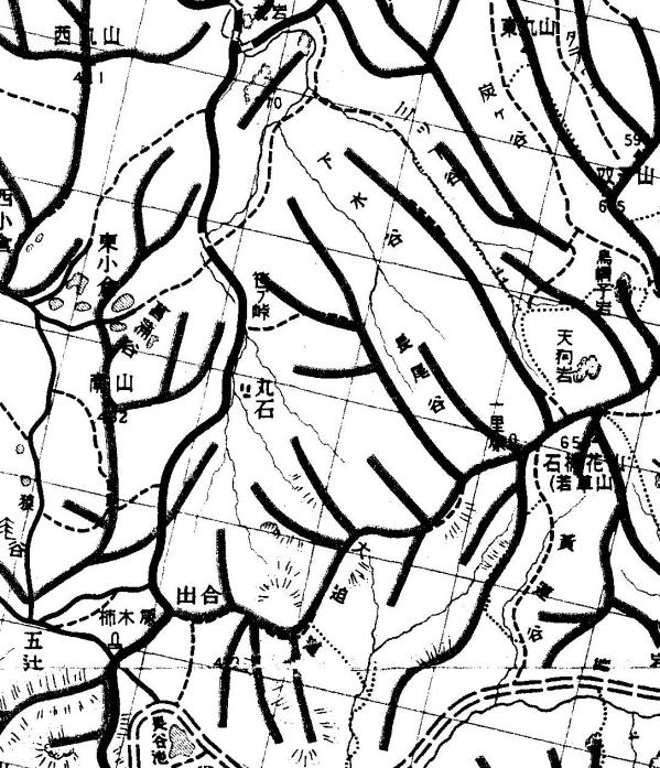 中村地図において、直木地図の下水谷は二ッ下谷にあたる。