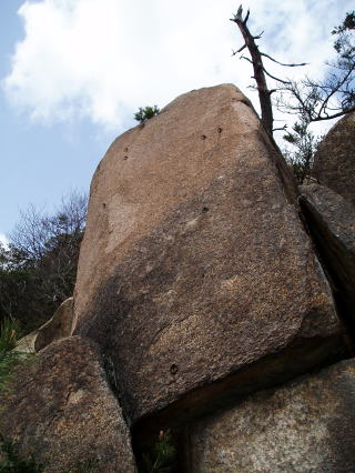 | (8)〜(12) ビックボルダー ビックというだけあって、ボルダー群のなかでも最大の見所だ。 クライミングの課題 8 鯨の頭 2m 9 チムニー 3m 10 くの字のクラック 8m 11 フレークハング 2m 12 爬虫類のカンテ 6m 場所:荒地山の肩の直下にある岩小屋を下ったところにある。ブラックフェースの上方。 |
