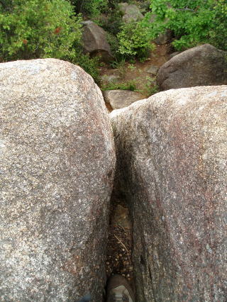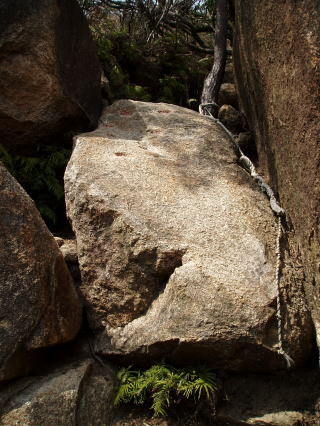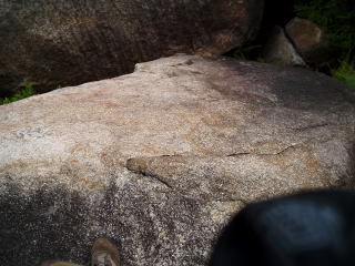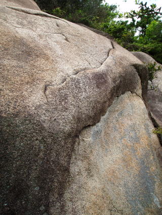| この岩が上の写真の岩の上部にあったと想定される。 | 右の岩の底面。 極めてフラットで、上の写真の岩の破断面と一致する。 |