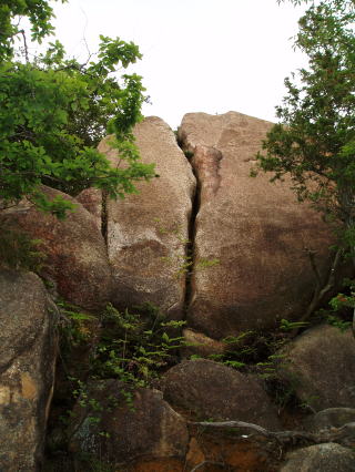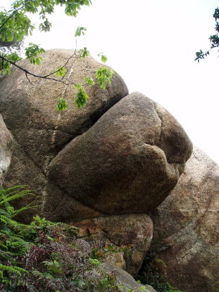 | 岩小屋から見た正面、縦にクラックが走る。 | 岩の頂部。深江の浜が見える。 | |