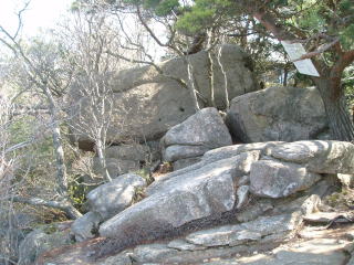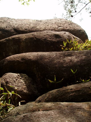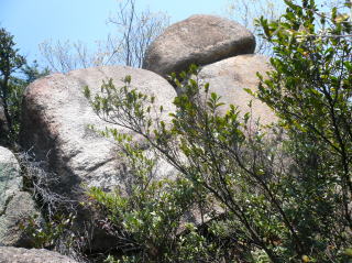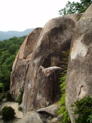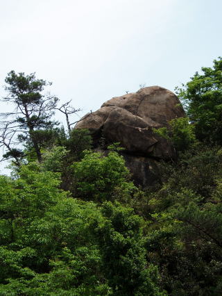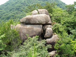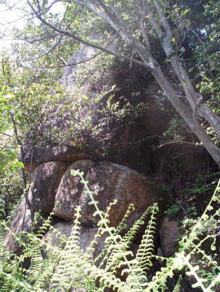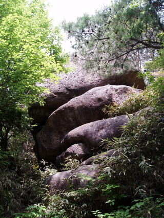 | 東から見た全景、樹林の下にも岩が続く | 左の写真の接近写真 | |