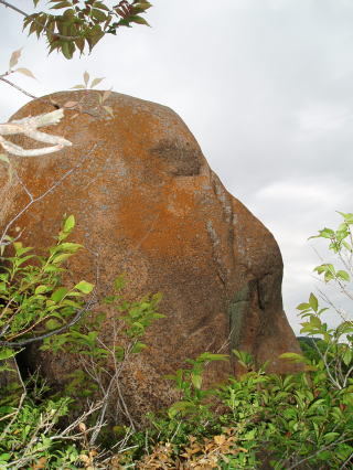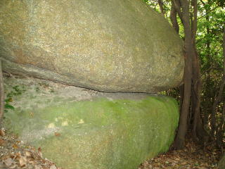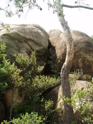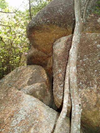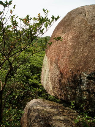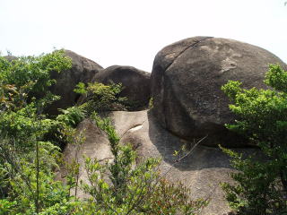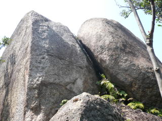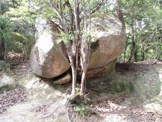 | 桃太郎岩 ネットを通じて知り合ったN氏の命名である。 岩を割って育つ木の生命力は驚くべきものがある。 場所:甲山森林公園の 仏性ヶ原西ピーク下 軽登山道脇 |