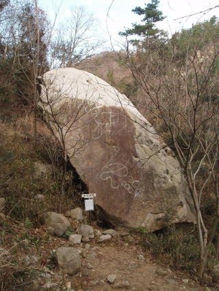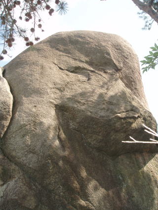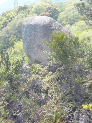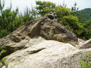 | ナマズ石 1995年の阪神大震災で、荒地山の山頂から落下した岩である。 岩の上に白く見えるのは、弥生時代に書かれた中国古代文字のロンサン文字といわれる。 ナマズ石が聖なる石とすれば、磐座の位置はナマズ石落下前の位置にあると考えられる。 詳細な調査をおこなえば、ペテログラフ(古代の岩文字)が見つかるかもしれない。 場所:弁天岩から南に少し歩いた所 ナマズ石のもとあった所は、危険につき行かないようにしてください。 |