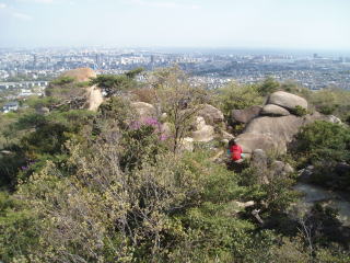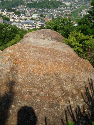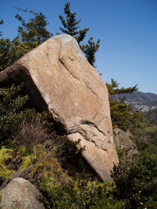 | 鐘の岩 甲山の北に五箇山と呼ばれる標高181mの低い山がある。この山頂には展望岩と呼ばれる3群の岩がある。この内、鐘の岩は中央の岩の集まりである。南に甲山、東に阪神の町並みを望み、眺めは抜群だ。 場所:五箇山 |