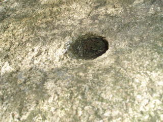 | 剣岩の頂部の西面にある穴、遠くからでもかなり目立つ。 | 穴の拡大(直径5cm 深さ8cm) | |