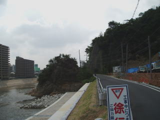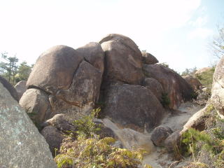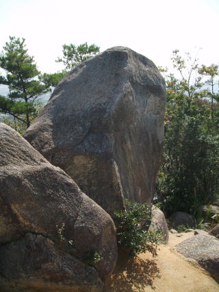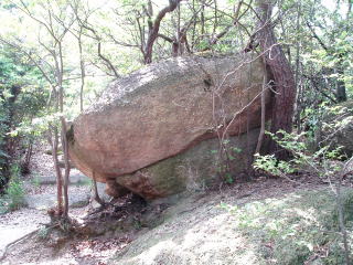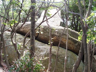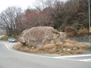 | 道路の中央に鎮座する巨大な岩 | 岩は中央で二つに割れている。 | |