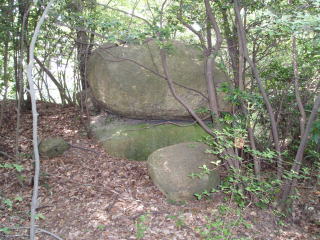 | 五つ岩 二つ岩があるなら、こちらは五つ岩である。 三、五、七は縄文人とっての聖なる数である。 2個の石を並べて2段に組んで台座とし、その上に巨石を置いたかに見える、いかにも人為を感じさせる石組である。 場所:北山北部 |