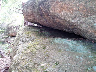 | Google Maps:20扇岩 扇岩 ナマズ石のもとあった所のすぐ上の稜線に、扇を少し開いたような巨岩がある。(詳細 第1部1章参照) この岩は聖なる岩「磐座」の可能性がある。 場所:道畦谷北尾根 弁天岩への分岐点を少し登ったところに、この岩に至る小道がある。分岐からすぐ。 |